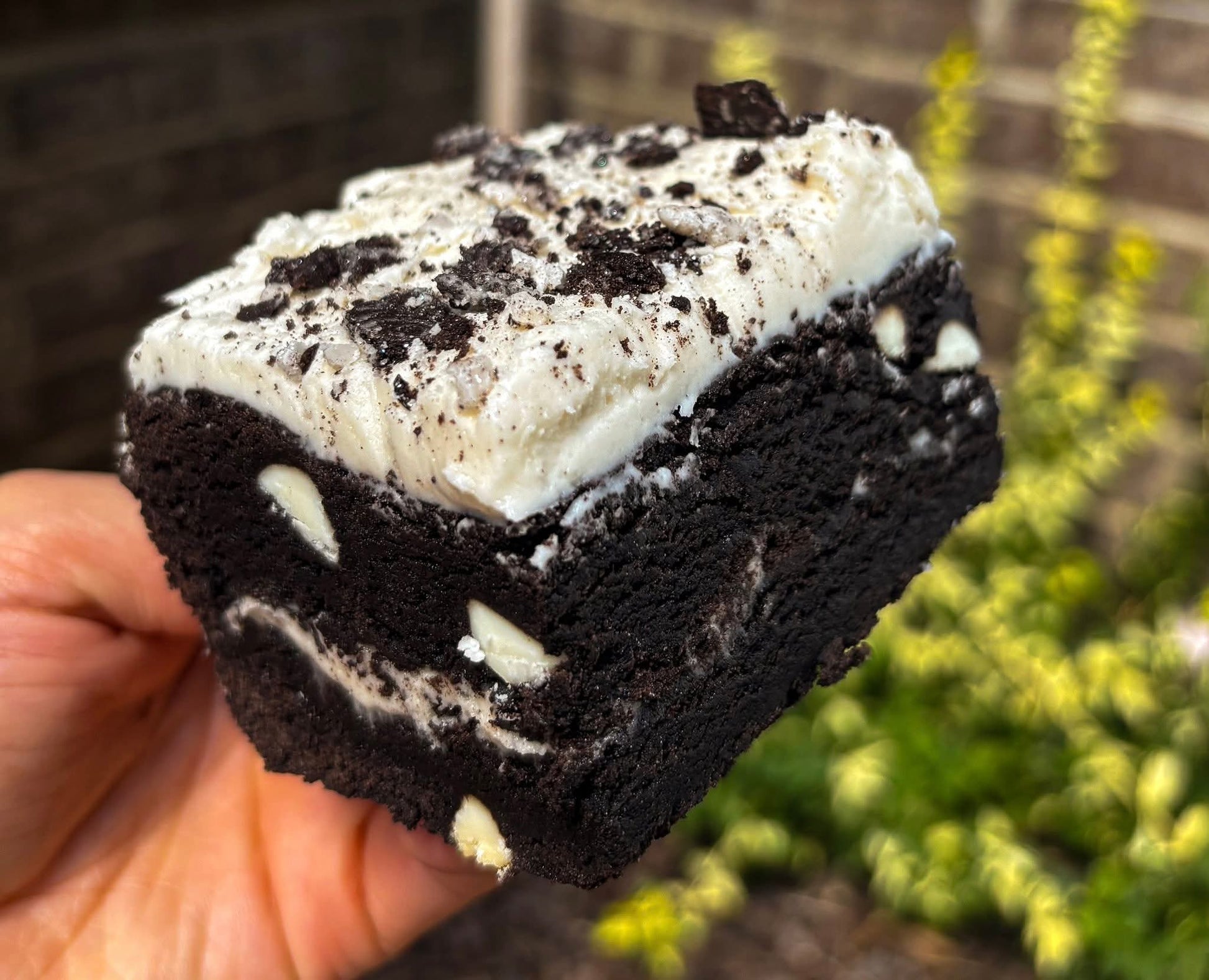 A decadent, dark-mode twist on a classic favorite. Each bar starts with a rich black cocoa cookie dough loaded with white chocolate chunks and cookies & cream pieces. At the center, a luscious white chocolate Oreo ganache is tucked between layers of soft, fudgy cookie. Topped with a swirl of creamy white chocolate buttercream and finished with a dusting of Oreo crumbs, this indulgent treat is a cookies-and-cream lover’s dream in every bite.