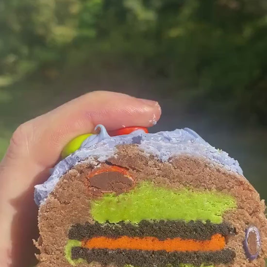 A double chocolate peanut butter cookie dough base, stuffed with a lime green peanut butter filling and a Halloween Oreo, topped with purple chocolate and Halloween M&M
